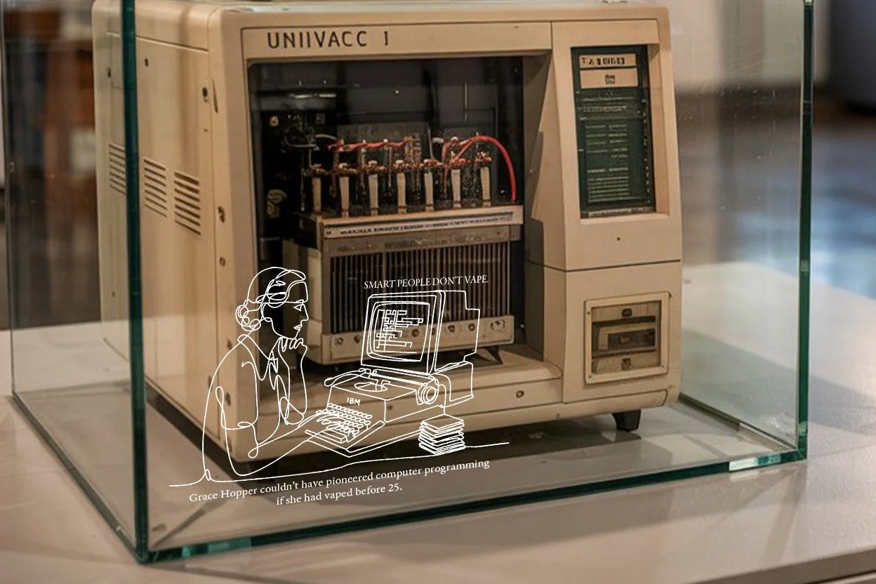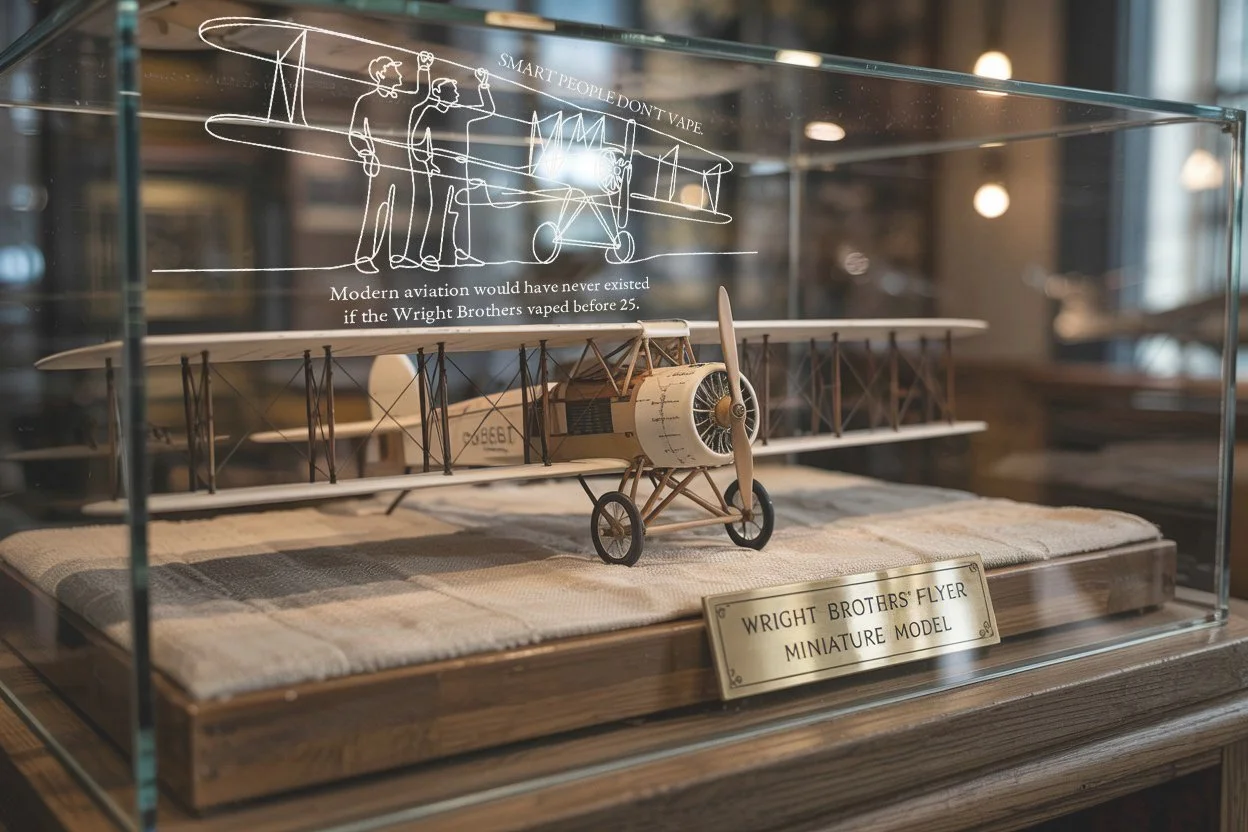 Stickers placed in science and history museums that explain what technological advances could have been lost if that person had vaped before 25.